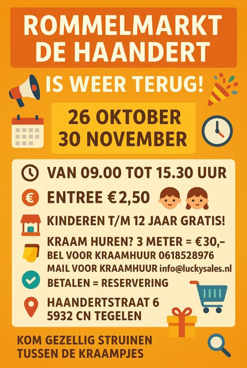 Rommelmarkt + Aan Google Kalender toevoegen + iCal / Outlook export 00 dagen 00 uren 00 minuten 00 secondes Datum 26 okt 2025 Tijd 9:00 am - 4:30 pm Deel dit evenement